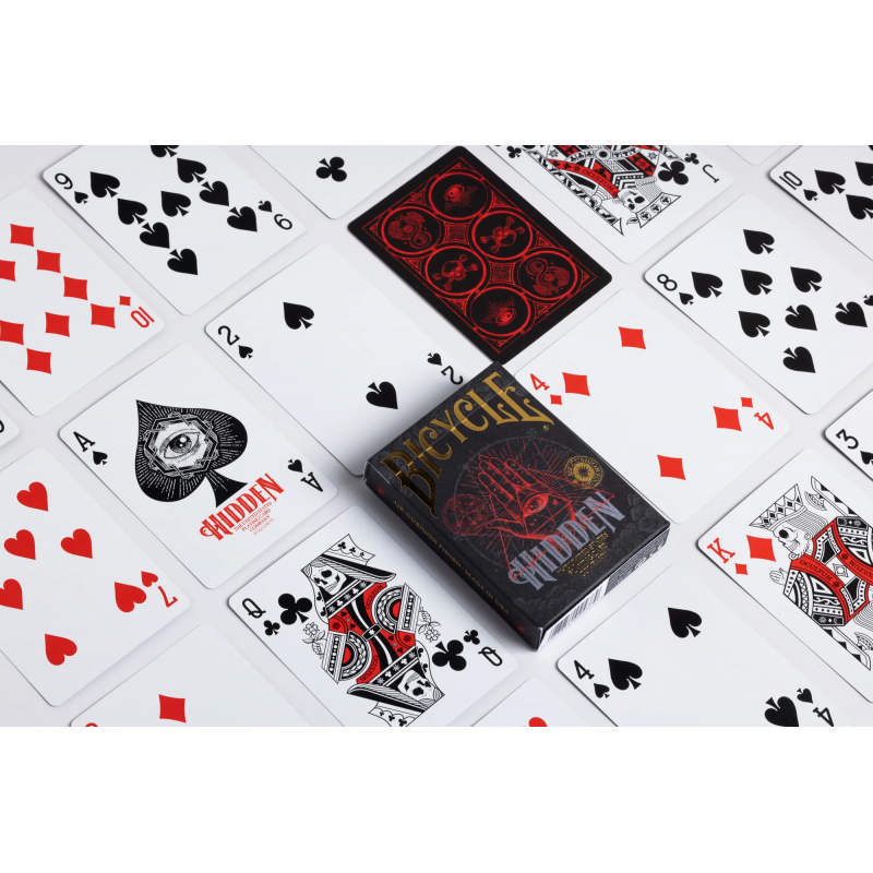 Bicycle Hidden Premium Oyun Kartları, gizli toplumların sembolizminden ilham alarak tasarlanmış özel bir destedir. Her kartın arka yüzü, gizemli sembollerle süslenmiş olup, kartlar üzerinde Freemasonluk ve diğer gizli toplumların simgeleri yer almaktadır. Bu destede, 52 standart kart ve 2 joker bulunmaktadır. Kartlar, ABD'de üretilmiş olup, yüksek kaliteli Bicycle marka kart stokuna basılmıştır ve Air-Cushion Finish® teknolojisiyle şık bir yüzey sunar. Bu özellik, kartların kolayca karıştırılmasını ve optimum performans sergilemesini sağlar. Bicycle Hidden destesi, koleksiyoncular, sihirbazlar ve gizemli sembolizme ilgi duyanlar için mükemmel bir tercihtir.