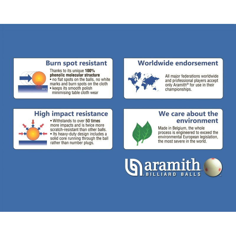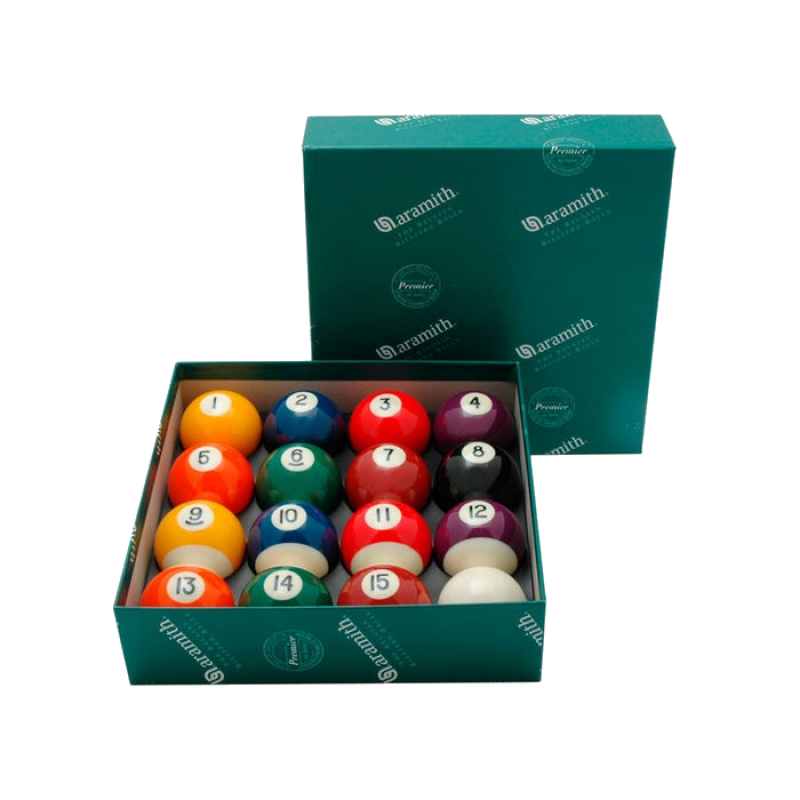 Belçika'da Saluc tarafından üretilen Aramith Premiere top seti, kalite ve dayanıklılığı bir araya getirerek ev ve ticari kullanımlar için ideal bir denge sunar. Polyester gibi standart malzemelerden üretilen toplara kıyasla beş kata kadar daha uzun ömür sunan gelişmiş fenolik reçine teknolojisi ile üretilmiştir. Bu üstün malzeme, topların darbelere ve çizilmelere karşı olağanüstü direnç göstermesini sağlar.