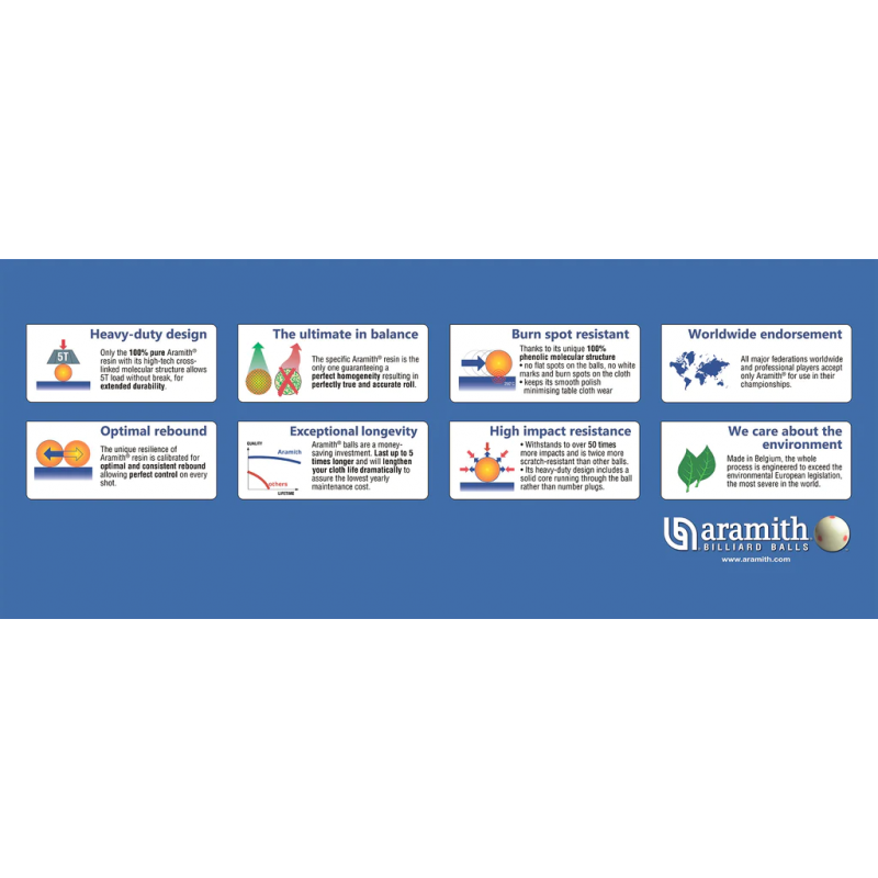 Üretici: Saluc Malzeme: Duramith™ Fenolik Reçine (4. Nesil) Çap: 57.2 mm (2 1/4 inç) Ağırlık: Standart turnuva ağırlığı (top başına yaklaşık 169 gr / 6 oz) Set İçeriği: 1 adet kırmızı noktalı Pro-Cup beyaz top, 15 adet TV renklerinde numaralı top Renk/Kaplama: TV için optimize edilmiş renkler (Pembe ve Açık Kahverengi dahil), vitrifiye yüzey