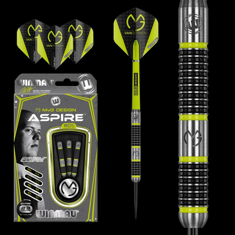 Üretici: Winmau Oyuncu: Michael Van Gerwen Malzeme: %80 Tungsten Gövde Şekli: Düz (Parallel) Ağırlık Dağılımı: Merkez Ağırlık: 23g Gövde Uzunluğu: 50.8mm Gövde Genişliği: 6.60mm Tutuş Teknolojisi: Halkalı Tutuş (Ring-grip profile) Tutuş Seviyesi: 4 (1 = Pürüzsüz, 5 = Agresif) Uç Tipi: Siyah yüksek gerilimli çelik uç Paket İçeriği: 3 adet MvG Aspire dart gövdesi, 3 adet MvG Design Naylon şaft (orta), 3 adet MvG Prism Delta flight, 1 adet MvG alüminyum uç koruyucu