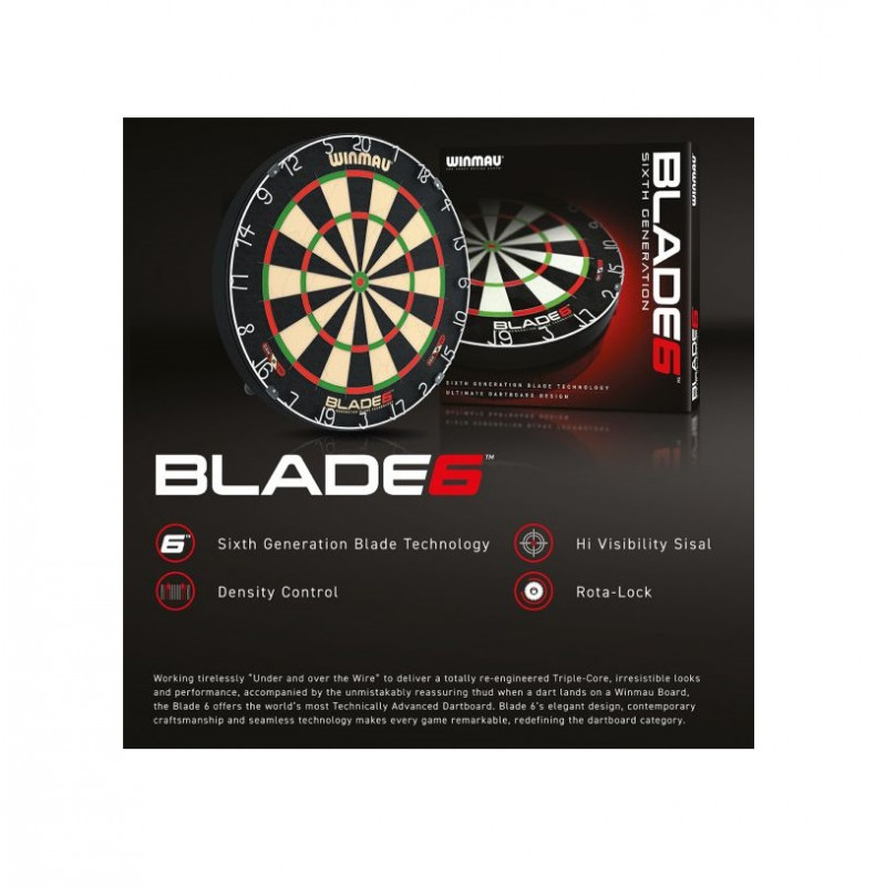 Winmau'nun efsanevi Blade serisinin altıncı nesli olan Blade 6, dart tahtası teknolojisindeki en son yenilikleri ve işçiliği bir araya getirir. Bu profesyonel düzeydeki tahta, olağanüstü bir oyun deneyimi, dayanıklılık ve performans sunmak üzere tasarlanmıştır. Blade 6'nın öncü tel tasarımı, optimum lif yoğunluğu ve double, triple ve bullseye bölgelerinde dart tutuşunu iyileştirmek için en son "Density Control™" tel teknolojisine sahiptir. Bu teknoloji, sisal liflerinin yoğunluğunu optimize ederek dartların skor bölgelerinde daha iyi kalmasını sağlar ve skor potansiyelini artırır. 60 derece açılı ultra ince tel, dartları skor alanına yönlendirerek sekme oranlarını mutlak minimuma indirir. En iyi kalite Doğu Afrika sisalinden üretilen ve Dünya Dart Federasyonu (WDF) turnuva özelliklerine uygun olan bu tahta, Rota-Lock montaj sistemi sayesinde her duvara kolayca monte edilebilir ve mükemmel bir şekilde ayarlanabilir.