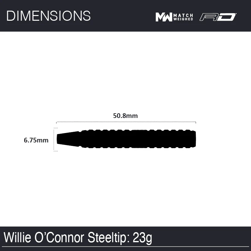 Üretici: Winmau Oyuncu: Willie O'Connor Malzeme: %90 Tungsten Ağırlık: 23g Gövde Uzunluğu: 50.8mm Gövde Genişliği: 6.75mm Uç Tipi: Çelik Uç (Steel Tip) Paket İçeriği: 3 adet Willie O'Connor dart gövdesi, 3 adet Vecta şaft (kısa), 3 adet Prism Standard flight
