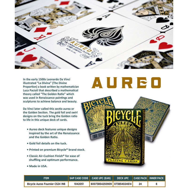 Bu poker boyutundaki deste, 52 standart kart, 2 Joker, 1 özel "Aureo" kartı ve 1 Bicycle reklam kartı olmak üzere toplam 56 kart içerir.. 2021 yılında piyasaya sürülmüş nadir bir Aureo varyantıdır.