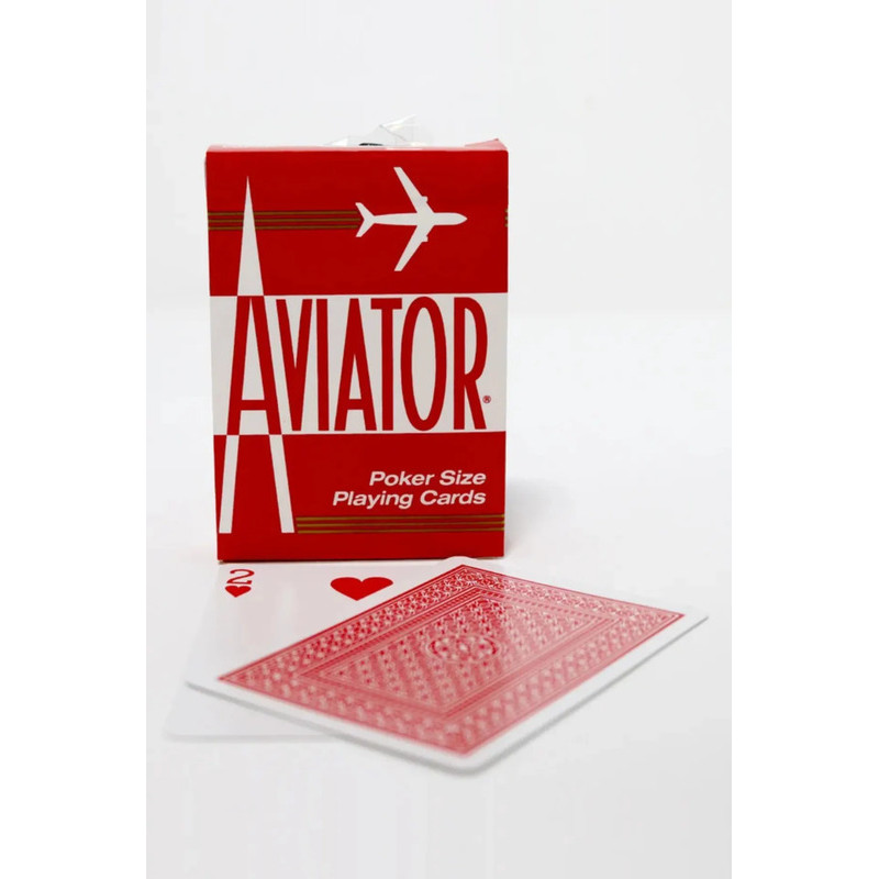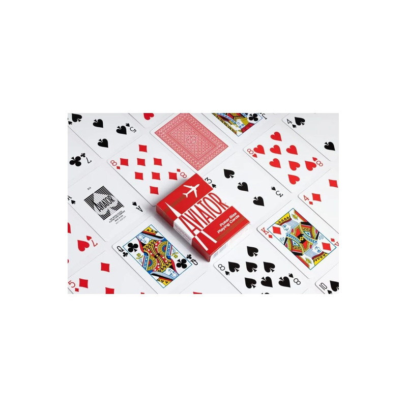 • Bu kırmızı Aviator oyun kağıdı destesi poker boyutunda ve standart indeksle gelir.