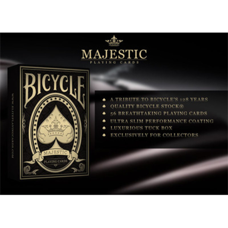 Bicycle Majestic Oyun Kartları, Bicycle markasının 128 yıllık mirasına saygı duruşunda bulunan, özel bir koleksiyon desteğidir. United States Playing Card Company (USPCC) ve Elite Playing Cards iş birliğiyle tasarlanmış bu sınırlı sayıdaki deste, koleksiyoncular ve sihirbazlar için özenle hazırlanmıştır. Kutusu, Premium Siyah Vellum kağıt ve altın folyo ile kaplanmış olup, her bir kart derin altın metalik mürekkeplerle süslenmiştir. Kartlar, özel ultra ince performans kaplamasıyla işlenmiş ve tamamen özgün tasarımlarla donatılmıştır. Deste, bir adet çok amaçlı "gaff" kartı ve 56 kart içermektedir. Bu özel baskı, yalnızca bir kez üretilmiş olup, koleksiyon değeri taşımaktadır.