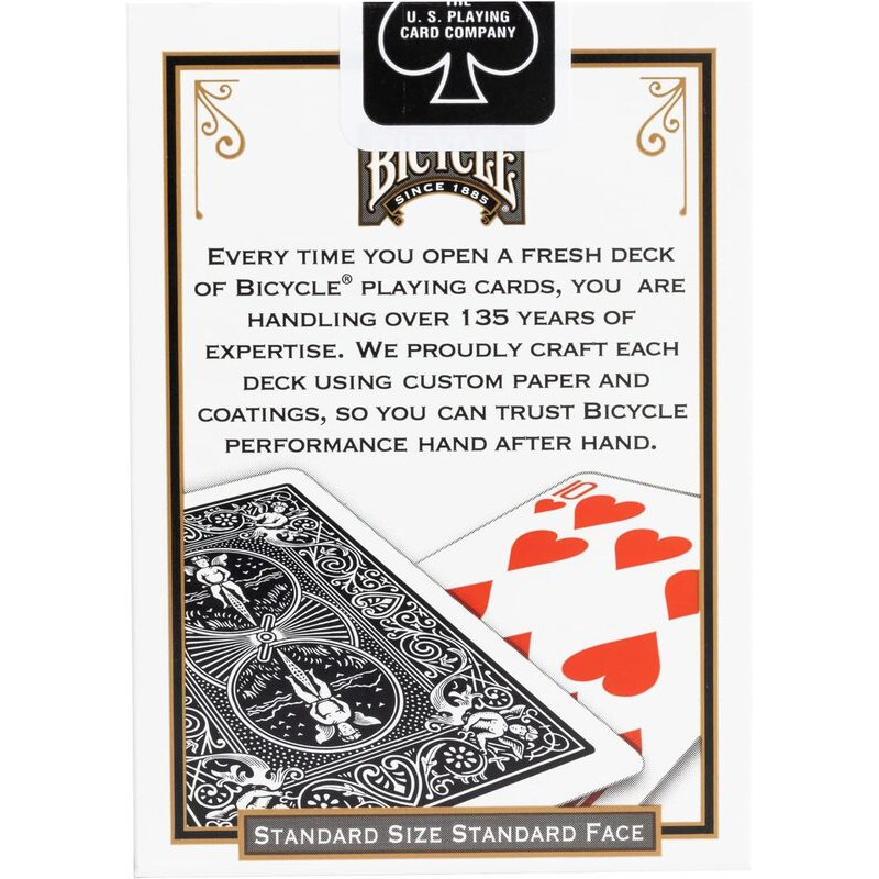 Bicycle Standart Siyah Oyun Kartları, kart oyunu tutkunları ve sihirbazlar için tasarlanmış, zarif ve dayanıklı bir destedir. ABD merkezli U.S. Playing Card Company (USPCC) tarafından üretilen bu kartlar, 1885 yılından bu yana güvenilirliğiyle tanınmaktadır. Poker boyutunda (3.5 x 2.5 inç) olan bu destede 52 kart, 2 joker ve 2 reklam kartı bulunmaktadır.