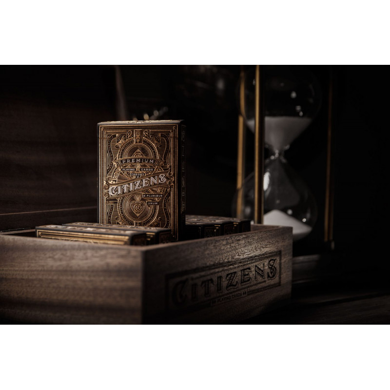 Citizens Oyun Kartları, Theory11’in bugüne kadar ürettiği en karmaşık ve göz alıcı deste olarak sunuluyor. Amerika’da, sürdürülebilir ormanlardan elde edilen FSC sertifikalı kağıda dayanılarak üretilmiştir; her kart ve kutu, yüksek özenle, elle işlenmiştir. İlk kez kutu tasarımında altın folyo, bronz folyo ve sıcak baskı teknikleri bir arada kullanılmıştır — bu kombinasyon, estetik açıdan çarpıcı ve sofistike bir görünüm kazandırır.