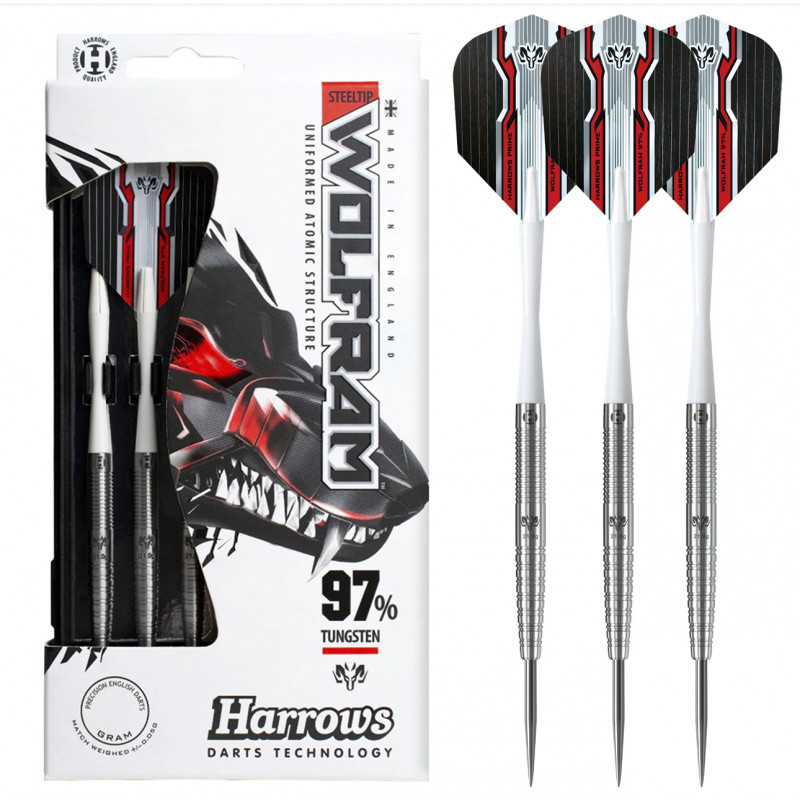 Harrows Wolfram serisi, adını saf tungstenden alarak markanın en ikonik dartlarından biri olmuştur. Enjeksiyonla kalıplanmış %97 tungsten alaşımından üretilen bu dartlar, atomik yapıda tek tip bir yoğunluk sunarak üstün güç ve mükemmel dengelenmiş bir ağırlık dağılımı sağlar. Bu olağanüstü yüksek tungsten yoğunluğu, profesyonel oyuncuların skor potansiyelini en üst düzeye çıkarmak için ultra ince bir gövde profili sunar. Gövde üzerindeki karmaşık tutuş deseni, ön kısımdaki ince halkalı bölüm ile orta ve arka kısımdaki ters kancalı kesimlerin (reverse hook cut) birleşiminden oluşur. Bu çok yönlü yüzey, her atışta oyuncuya mutlak kontrol ve tutarlı bir serbest bırakma (release) imkanı tanır. Göz alıcı siyah titanyum nitrür ve mavi metalik kaplama, hem dayanıklılığı artırır hem de darta estetik bir üstünlük kazandırır.