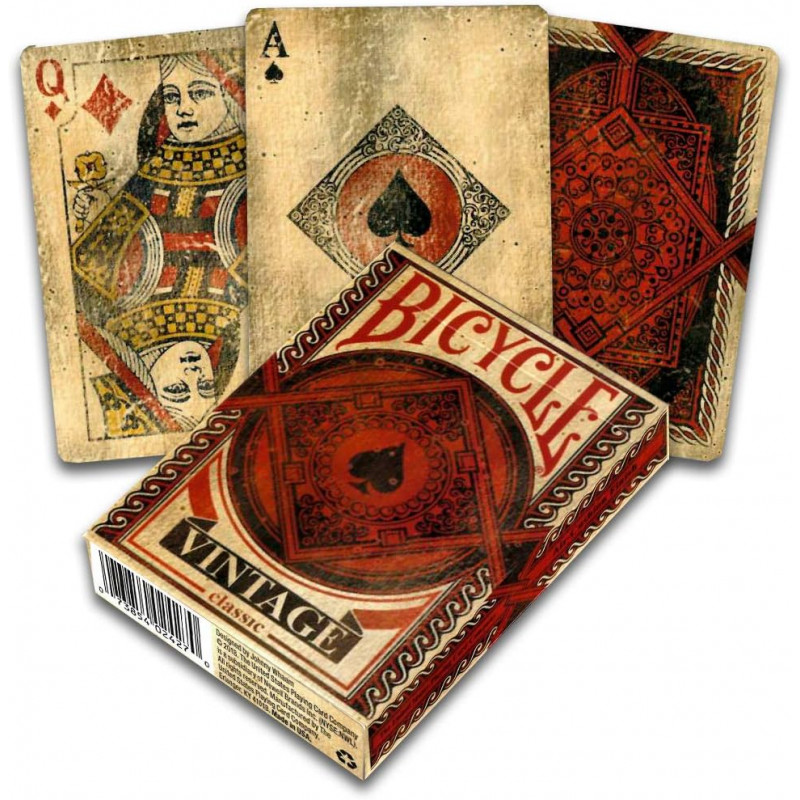 Bicycle Vintage Classic Oyun Kartları, klasik kart oyunlarını nostaljik bir dokunuşla yeniden yorumlayan özel bir destedir. ABD merkezli U.S. Playing Card Company (USPCC) tarafından üretilen bu kartlar, vintage tasarımı ve modern baskı kalitesiyle dikkat çeker. Her bir kart, sararmış parşömen kağıdını andıran özel bir yaşlandırma efektiyle tasarlanmıştır. Bu estetik, kartların arka yüzeyinde ve kutu tasarımında da kendini gösterir.