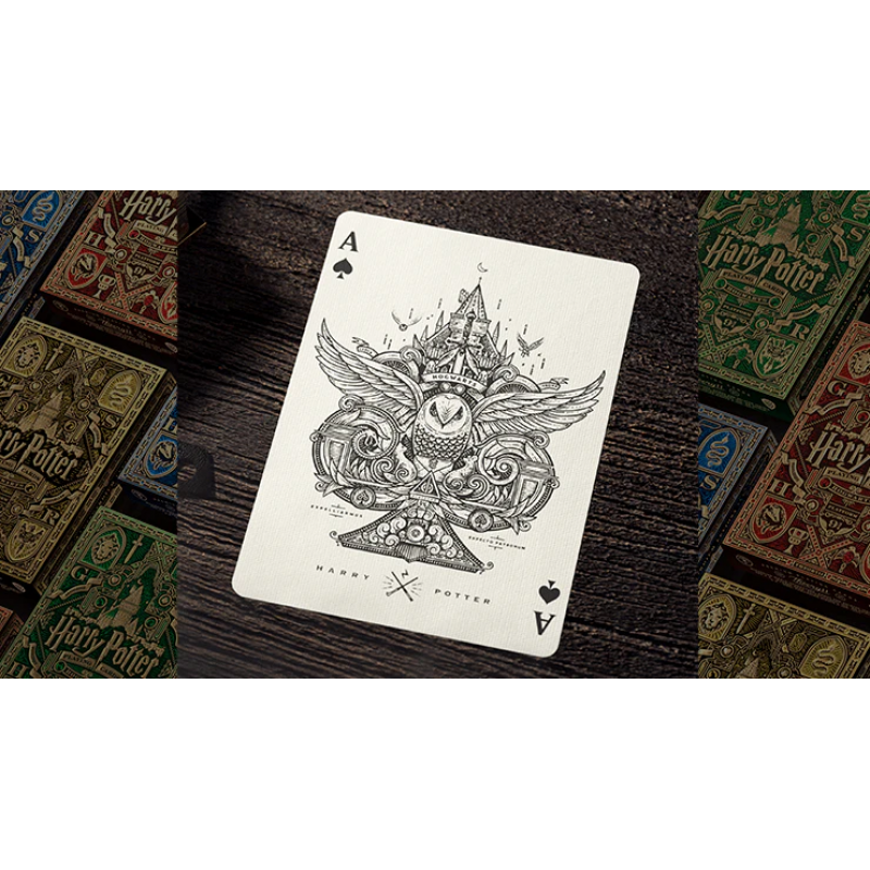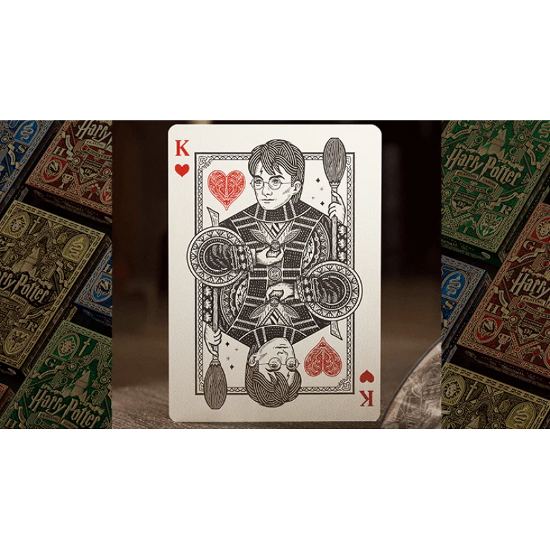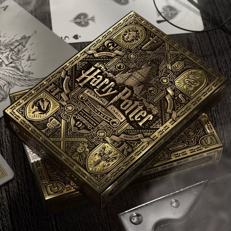 Kartların yüzeyinde tamamen özel olarak tasarlanmış Aces, Jokerler ve court kartları; Harry’nin Golden Snitch ve Nimbus 2000 ile, Voldemort’un yew ağacından yapılmış asasıyla, Snape’in İleri İksircilik kitabı ile öğretmenlik sahneleri veya Luna Lovegood’un Spectrespecs gibi ikonik anlar yer alıyor.