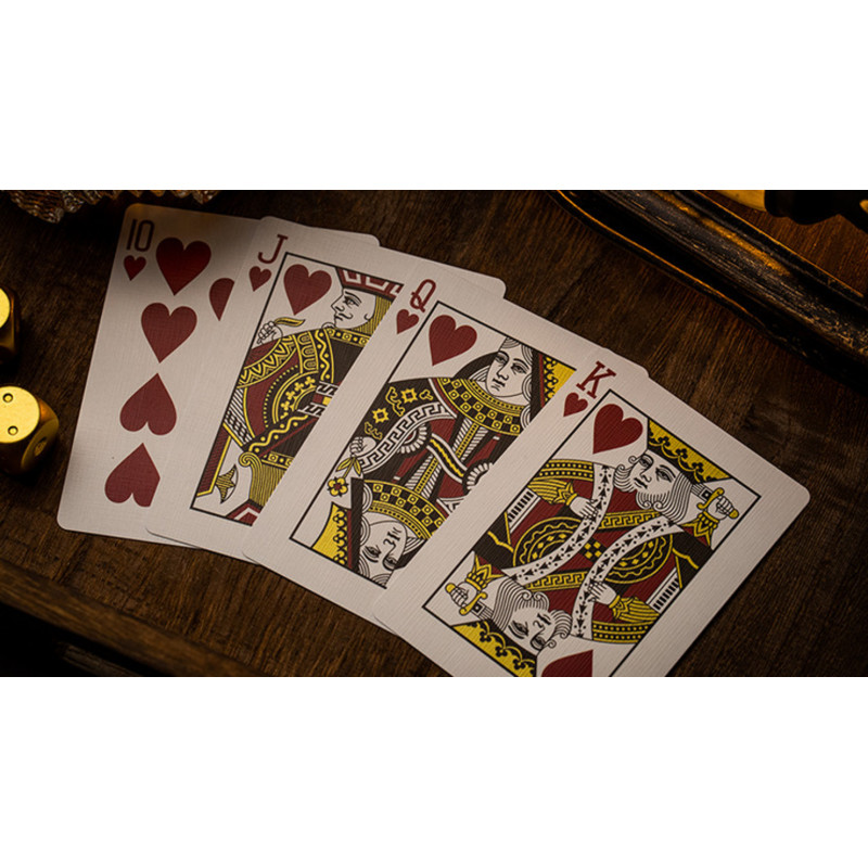 Kartlar, Cartamundi’nin Cold Foil baskı teknolojisi, Slimline Paper Stock ve B9 True Linen Finish kullanılarak üretilmiştir. Bu kombinasyon, olağanüstü görsel kalite ve üstün kullanım hissi sunar. Kutular, 300 gsm mat ve ışıl ışıl bir kağıt üzerine 4 katlı 3D kabartma, Kurz marka sıcak folyo baskı ve iç yüzeyi de folyo kaplama özellikleriyle öne çıkar. Ayrıca, her deste özel olarak elle uygulanan folyo mühür ve numaralı bir seri ile ekstra çekicilik kazanır.