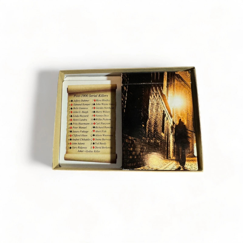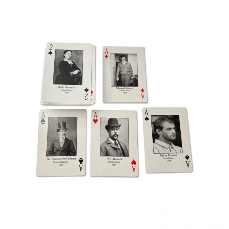Serial Killer Playing Cards, Amerikalı en ünlü seri suçluların portrelerini içeren özel bir kart destesidir. Her kart, bir seri katilin fotoğrafını, takma adını, hayattan kopardığı kişi sayısını, aktif olduğu dönemi ve yöntemlerini detaylı bir şekilde sunar. Bu desteler, suç tarihi ve psikolojiye ilgi duyanlar için eşsiz bir koleksiyon parçasıdır.